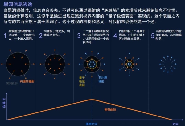 他们还发现随着黑洞的蒸发,原本黑洞深处的粒子不再是黑洞的一部分,而成为辐射的一部分。粒子并没有飞出黑洞,只是被重新分配了。正是这些内部粒子造成了黑洞和辐射之间的纠缠熵。如果其不再是黑洞的一部分,它们就不再对熵有贡献,这也解释了熵为何开始减少。