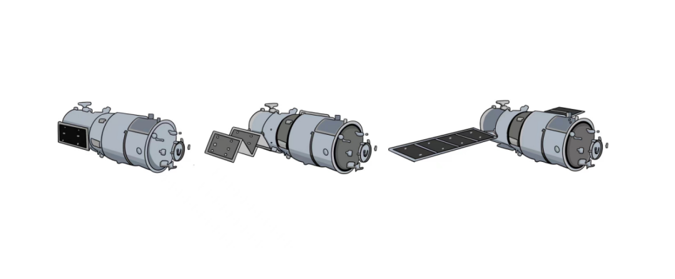 另外,我们不难发现,在有限的发射重量约束条件下,要保障大功率负载长时间正常运转,太阳能电池是最为合理的选择。在航天器的不同飞行阶段,太阳能帆板的状态会有所转换。在升空阶段,为避免迎面空气动力流的影响,帆板折叠收藏在整流罩内;进入轨道后,它们则展开为航天器提供电力。